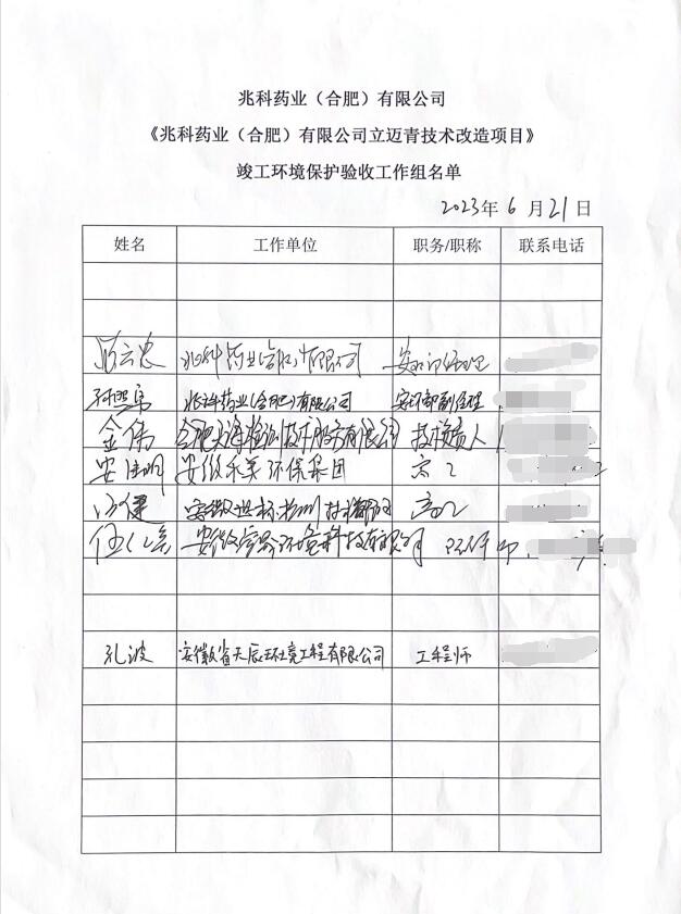 兆科藥業(合肥)有限公司立邁青技術改造項目竣工環境保護驗收報告公示