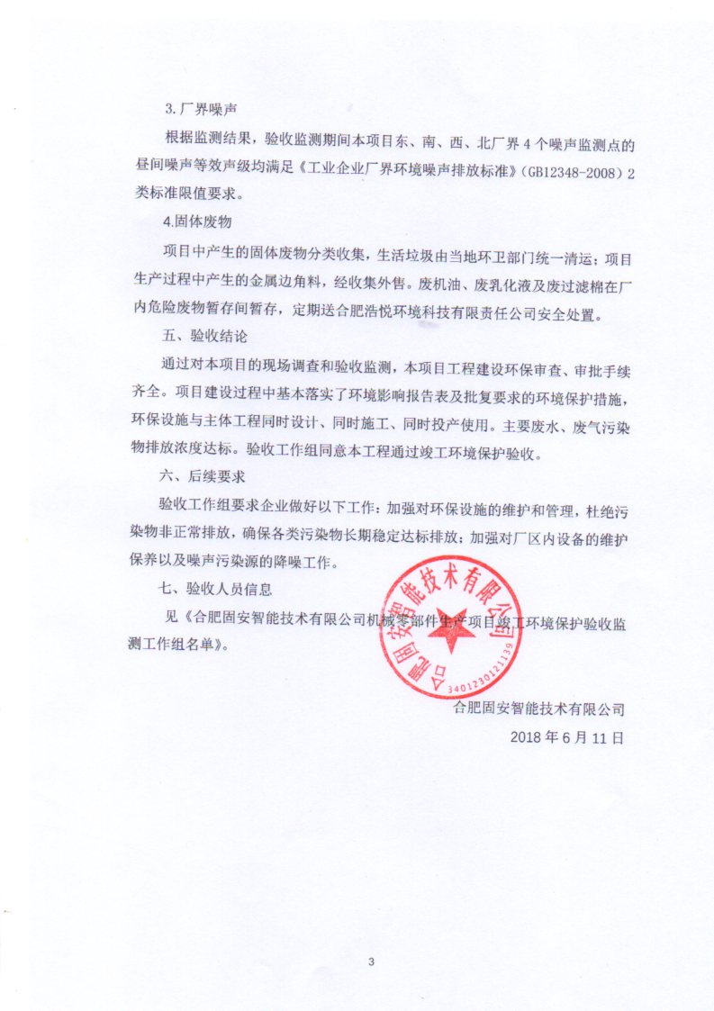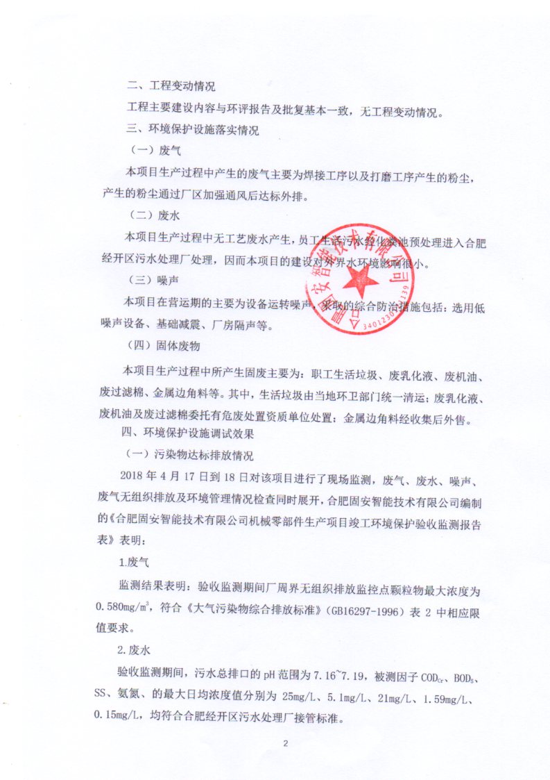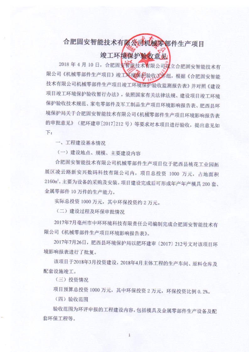 根據《國務院關于修改〈建設項目竣工環境保護管理條例〉的決定》(國務院令第682號),以及環保部《關于發布<建設項目竣工環境保護驗收暫行辦法>的公告》(國環規環評[2017]4號),現將合肥固安智能技術有限公司機械零部件生產項目竣工環境保護驗收內容公式如下: