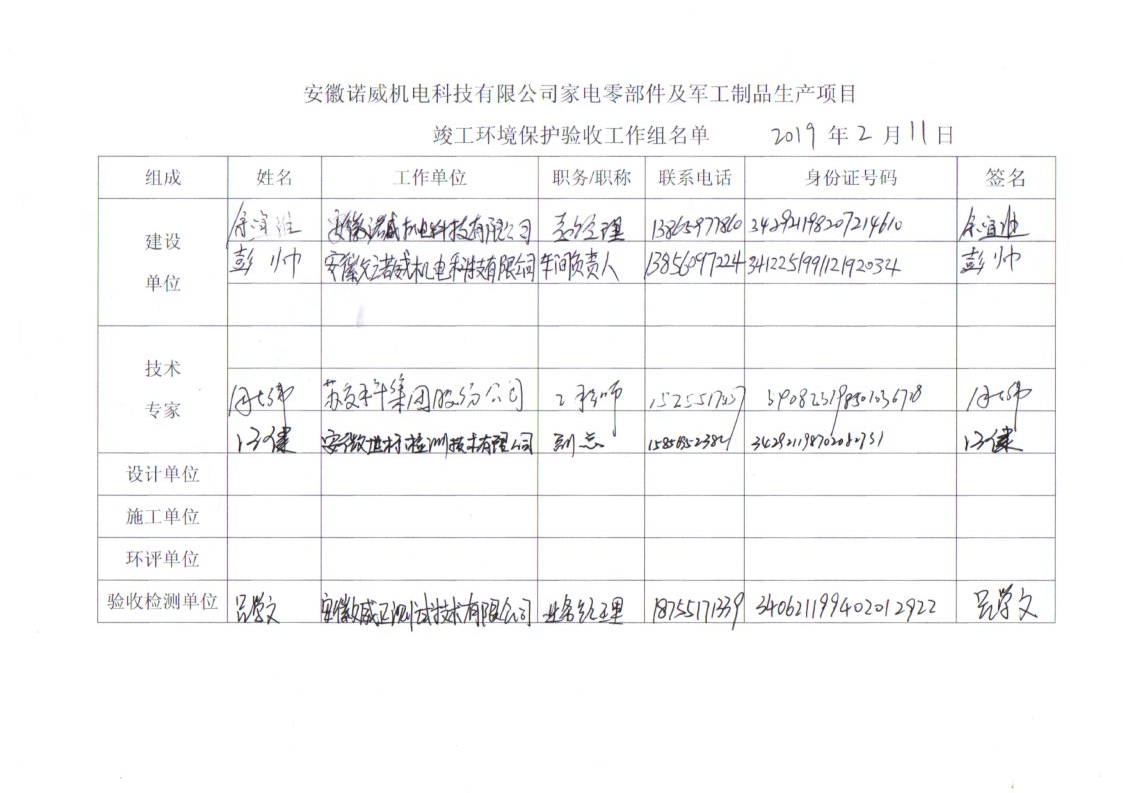 安徽諾威機電科技有限公司家電零部件及軍工制品生產項目竣工環境保護驗收報告公示